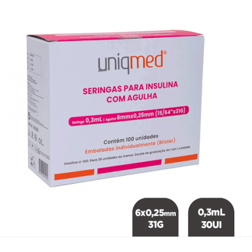 SERINGA UNIQMED 30 UI COM AGULHA 6MM C/ 100 UNID